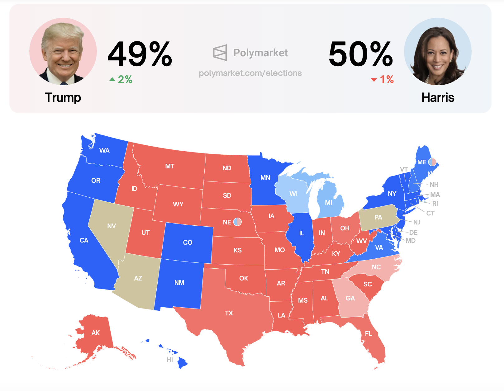 По мере приближения выборов, которые состоятся в ноябре, шансы на победу Камалы Харрис и Дональда Трампа на Polymarket почти равны.