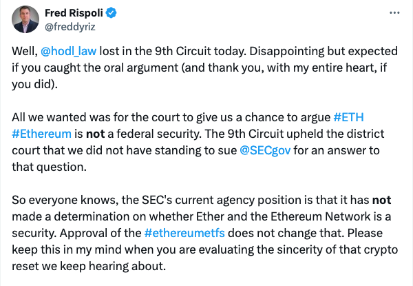 Судьи поддержали решение суда Калифорнии отклонить дело в июле 2023 года, постановив, что Hodl Law не удалось найти доказательств того, что SEC занималась «окончательным действием агентства», то есть регулятор решил, что ETH является ценной бумагой.