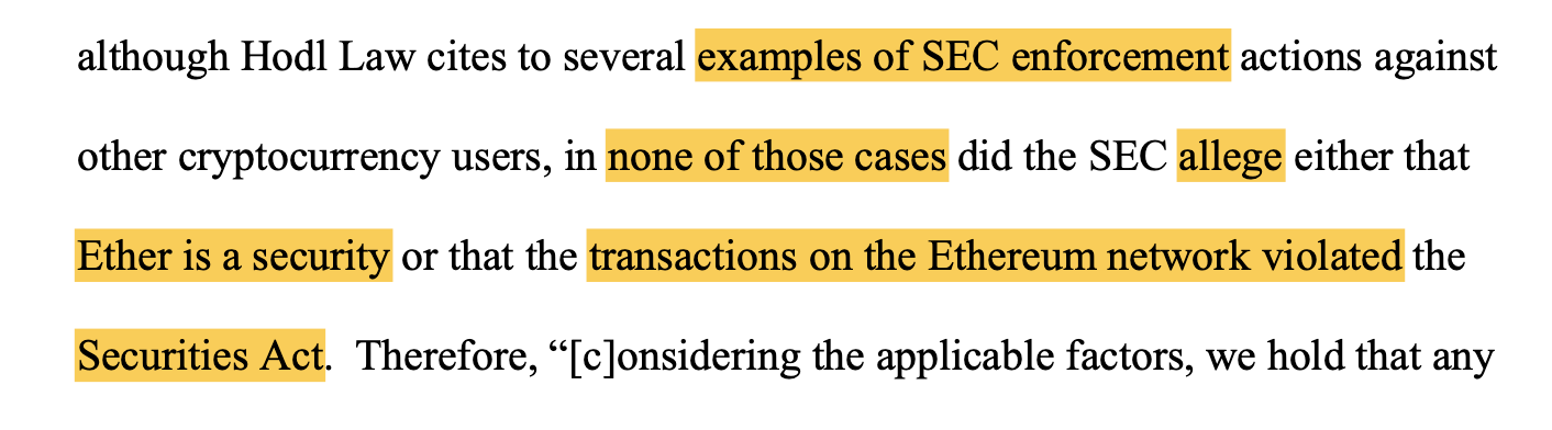 Выделенный отрывок из заключения коллегии, в котором говорится, что SEC не утверждала, что ETH является ценной бумагой, ни в одном из своих действий по обеспечению соблюдения нормативных требований. Источник: Pacer.