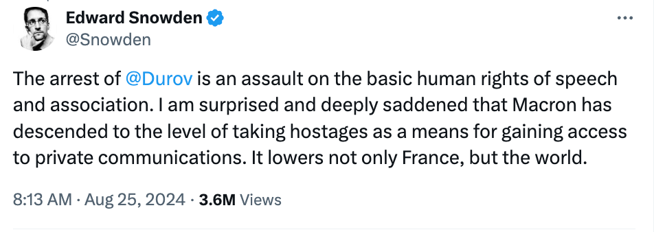 «Арест Дурова — это посягательство на основные права человека на свободу слова и объединений. Я удивлен и глубоко опечален тем, что Макрон опустился до уровня взятия заложников как средства получения контроля над частными коммуникациями. Это унижает не только Францию, но и весь мир», – написал в твиттере Эдвард Сноуден.