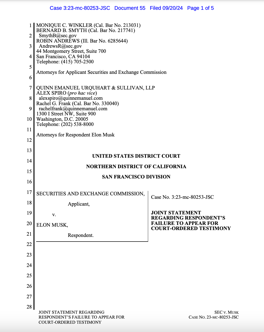 Более конкретно, SEC намерена применить санкции против Маска, приказав ему «предъявить причины, по которым он не должен привлекаться к ответственности за неуважение к суду» за предполагаемое нарушение первоначальных условий соглашения, предусмотренных в постановлении от мая 2024 года, которое установило дату дачи показаний 19 сентября.