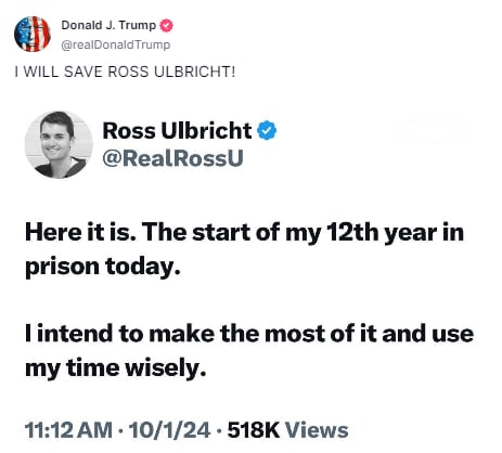 1 октября 2024 года Ульбрихт в своем X (ранее Twitter) написал, что начался его 12 год и тюрьмы. Он добавил, что стремится получить максимум пользы от своего пребывания за решеткой и «использовать свое время с умом».