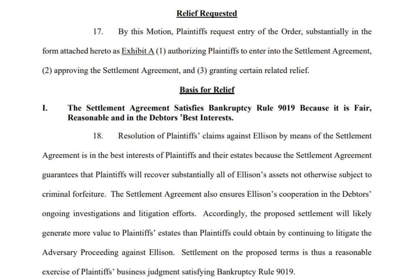 FTX утверждает, что данное соглашение так же выгодно, как и продолжение судебного преследования Эллисон в смежном деле, поскольку оно дает «практически все, что они могли бы взыскать» в любом случае, а ее сотрудничество представляет существенную ценность.