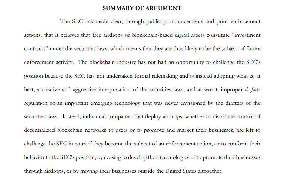 «SEC сделала эту угрозу «достоверной», возбудив по меньшей мере четыре иска о принудительном исполнении, утверждая, что аирдропы цифровых активов представляют собой «инвестиционные контракты» и, следовательно, сделки с ценными бумагами».