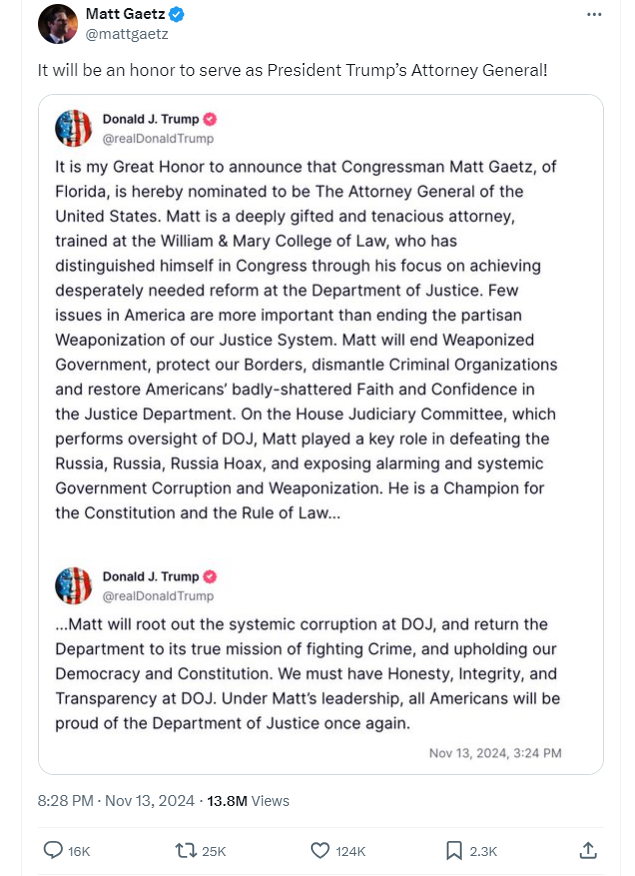 13 ноября избранный президент США Дональд Трамп выдвинул представителя Мэтта Гетца на пост генерального прокурора, что побудило Гетца объявить о своей «вступающей в силу немедленно» отставке из Конгресса.