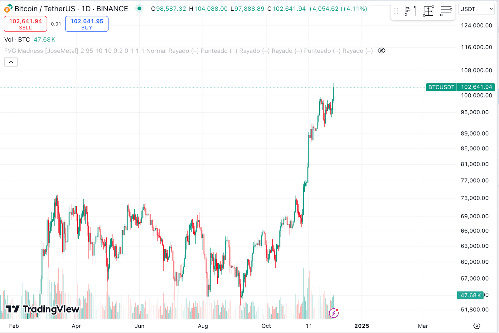 На фоне информации о номинировании Аткинса председателя SEC биткоин достиг рекордной цены в $104 088. На момент написания статьи первая криптовалюта торгуется по цене более $102 600.