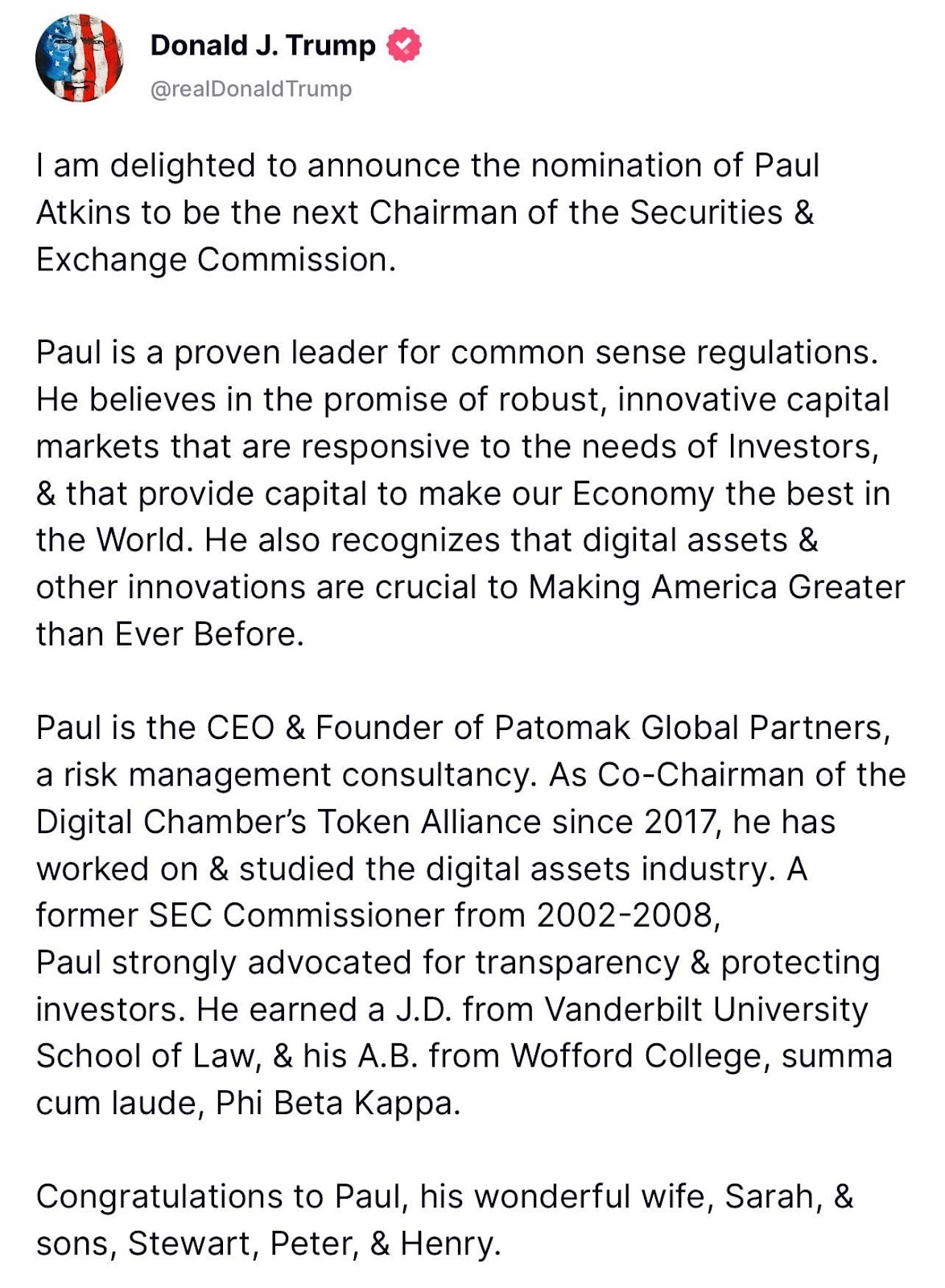 «Он [Пол Аткинс] признает, что виртуальные активы и другие инновации сделают Америку мощнее, чем когда-либо», — считает Трамп.