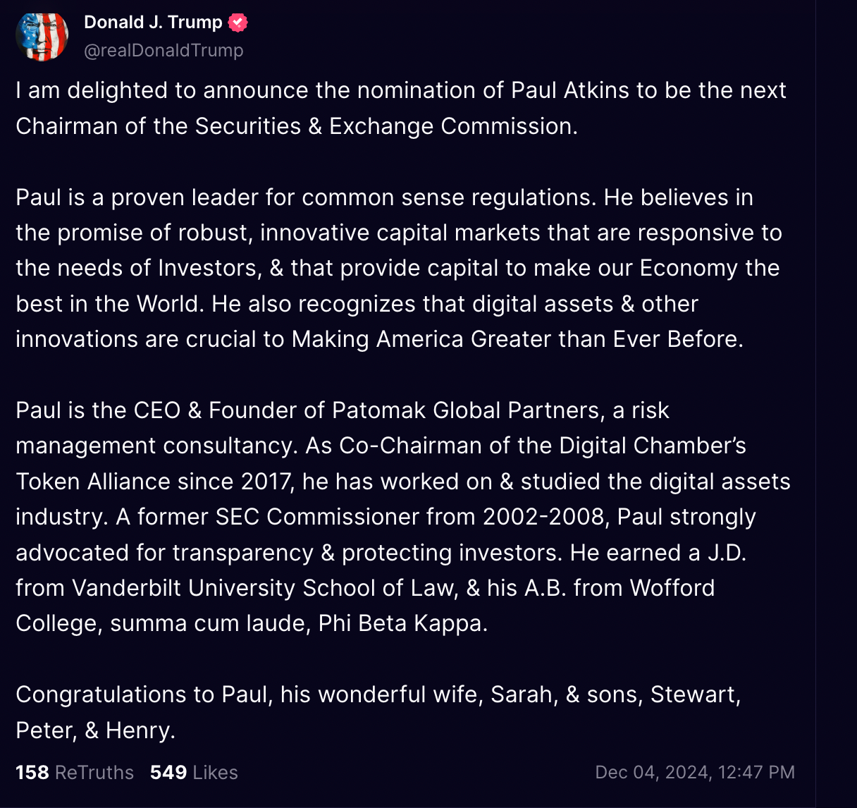 В объявлении от 4 декабря Трамп подчеркнул послужной список и опыт Аткинса в качестве бывшего комиссара SEC.