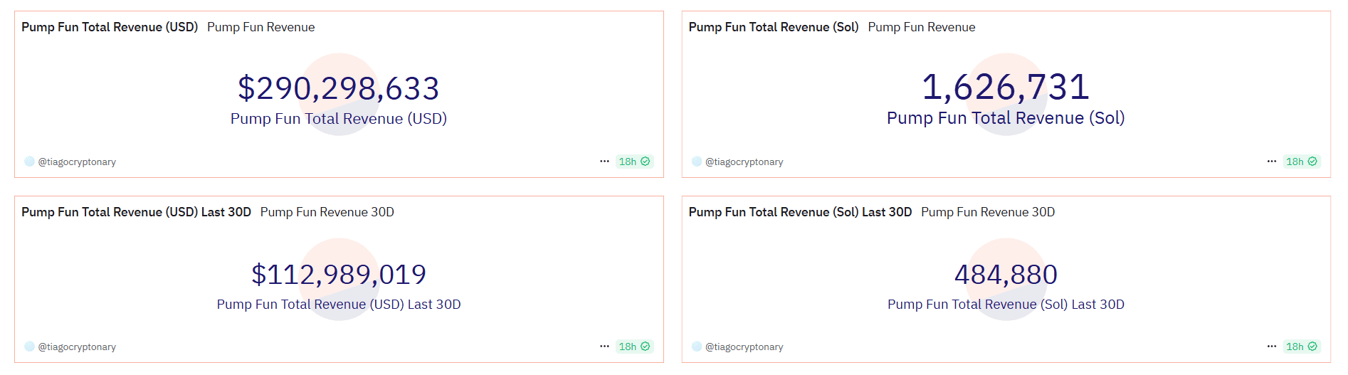 С момента выхода на рынок платформа pump.fun принесла более $290 млн дохода, согласно информации портала Dune. При этом за последние 30 дней этот показатель превысил $112 млн.