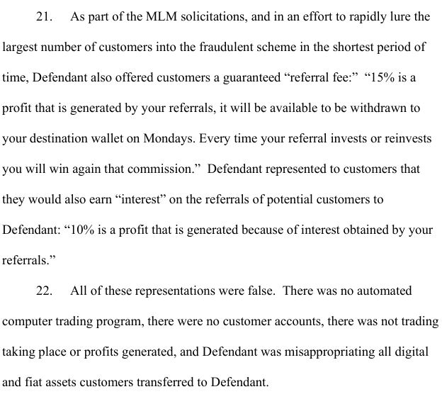 «Не было автоматизированной компьютерной торговой программы, не было клиентских счетов, не было торговли или получения прибыли, и ответчик незаконно присваивал все цифровые и фиатные активы, переданные клиентами», — добавила она.