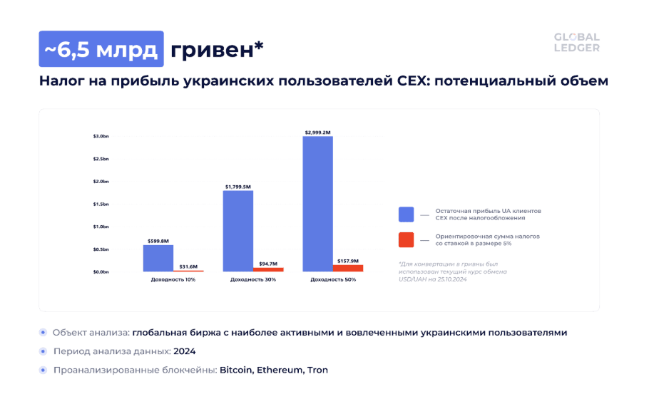 Для отчета эксперты компании отобрали 21 CEX, включая шесть украинских. Они рассчитали предполагаемую прибыль на основе открытых данных, она составила 46 млрд гривен, после чего подсчитали объем налогов с учетом ставки в 18%.
