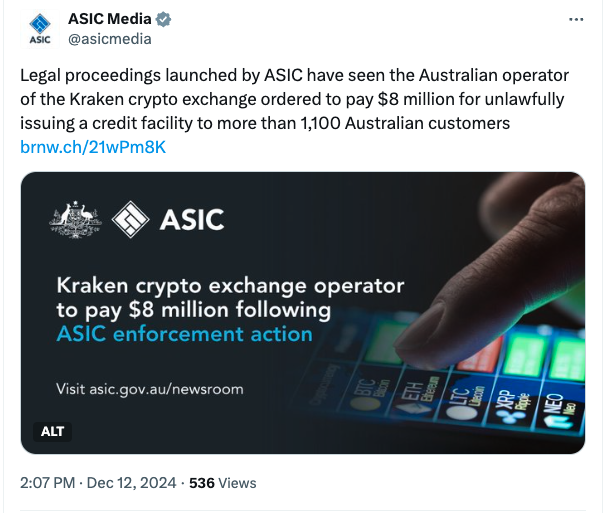 Федеральный суд Австралии оштрафовал австралийского оператора американской криптовалютной биржи Kraken на 8 млн австралийских долларов (5,1 млн долларов) после того, как он встал на сторону корпоративного регулятора страны.