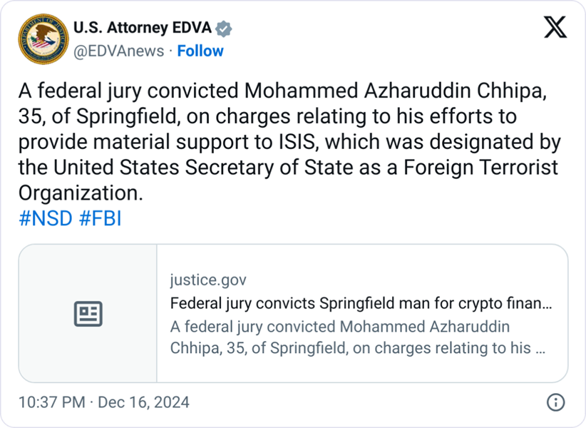 Мохаммед Ажаруддин Чипа, 35-летний мужчина из Спрингфилда, штат Вирджиния, был осужден федеральным судом присяжных за пожертвования криптовалюты запрещенной в РФ террористической организации «Исламское государство Ирака и Леванта» (ИГИЛ).