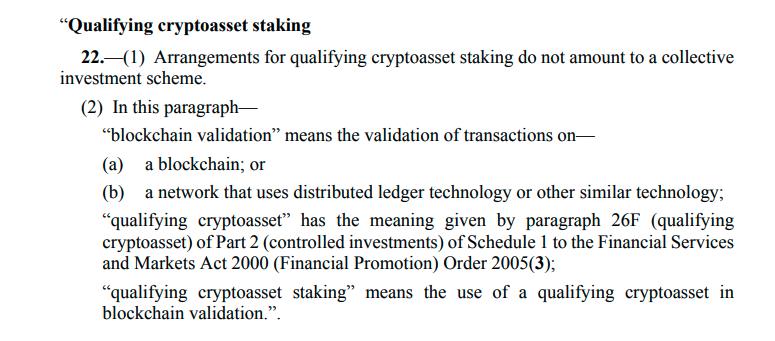 Постановление министерства от 8 января вносит поправки в раздел Закона о финансовых услугах и рынках 2000 года о групповых инвестициях, добавляя, что «соглашения о квалификационном стекинге криптоактивов не являются коллективной инвестиционной схемой CIS».