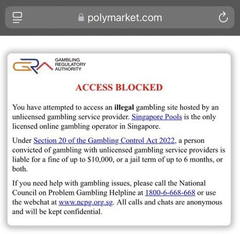 Сообщения об отказе в доступе начали появляться вечером 12 января. Вице-президент криптосервиса Cobo Алекс Зуо опубликовал в соцсети X скриншот официального уведомления от Управления по регулированию азартных игр Сингапура (GRA), которое появляется при попытке перейти на сайт Polymarket в Сингапуре.