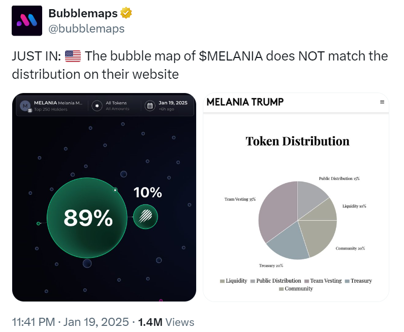 Хотя некоторые инсайдеры криптоиндустрии видят в этом новую эру для мемокоинов, распределение их токенов вызвало опасения у инвесторов, учитывая, что почти 90% предложения токенов MELANIA находилось в одном кошельке, сообщил Bubblemaps в сообщении X от 19 января.