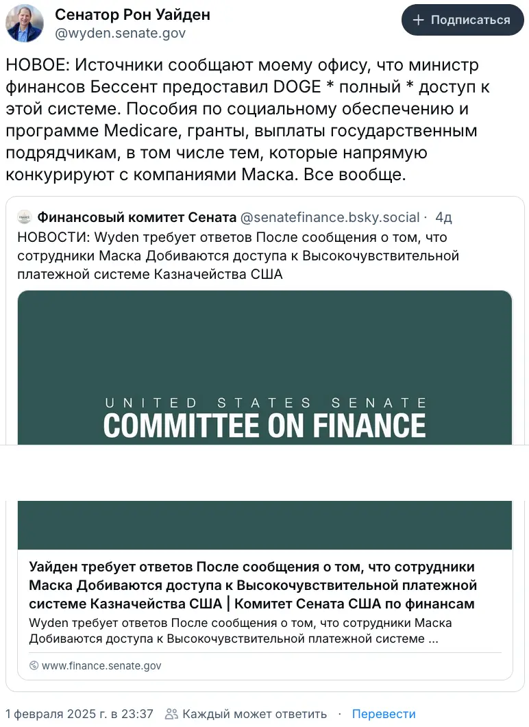 В жалобе цитировался пост сенатора США Рона Уайдена на Bluesky от 1 февраля, в котором говорилось, что источники сообщили его офису, что «Бессент предоставил DOGE *полный* доступ» к платежной системе Казначейства. Днем ранее Уайден потребовал от Бессента ответов по поводу доступа Маска DOGE к системе.