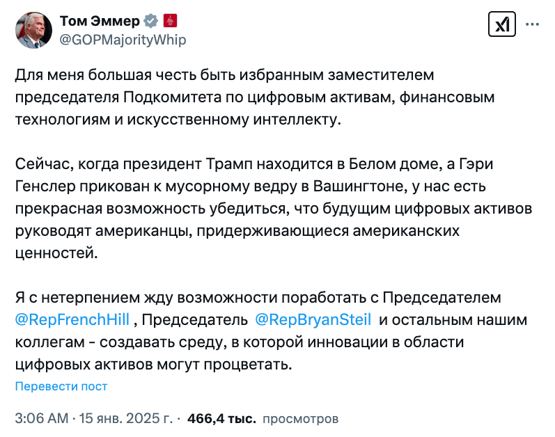 Законодатели также высказались, а представитель-республиканец Том Эммер заявил, что «принятие всеобъемлющего законодательства о рыночной структуре и стейблкоинах» будет главным приоритетом в Конгрессе.