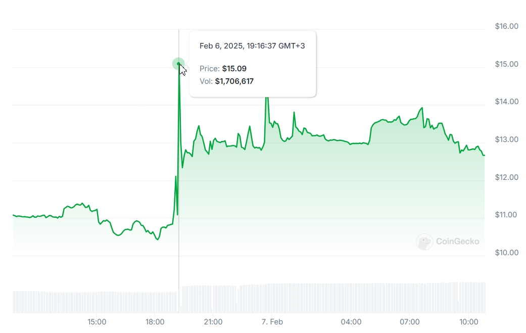 На фоне новости о выходе Перцева из тюрьмы токен Tornado Cash ($TORN) резко вырос, почти на 40%. По итогам суток цена $TORN увеличилась на 15,6%, на 11:00 мск 7 февраля он торгуется около $12,7.