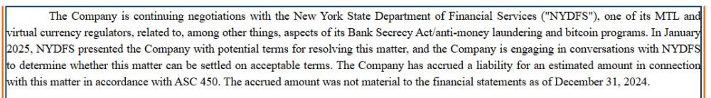 В заявлении от 24 февраля в Комиссию по ценным бумагам и биржам Block заявила, что «продолжает переговоры» с Департаментом финансовых услуг штата Нью-Йорк (NYDFS) по «среди прочего, аспектам Закона о банковской тайне/программ по борьбе с отмыванием денег и биткоину».