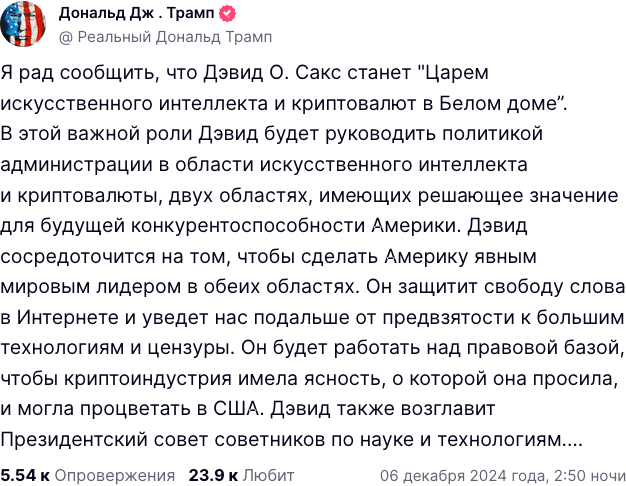 Сакс был назначен главой Белого дома по криптовалютам и искусственному интеллекту 6 декабря 2024 года для «работы над правовой базой, чтобы криптоиндустрия получила ясность, о которой она просила, и могла процветать в США», — написал Трамп в своем объявлении.