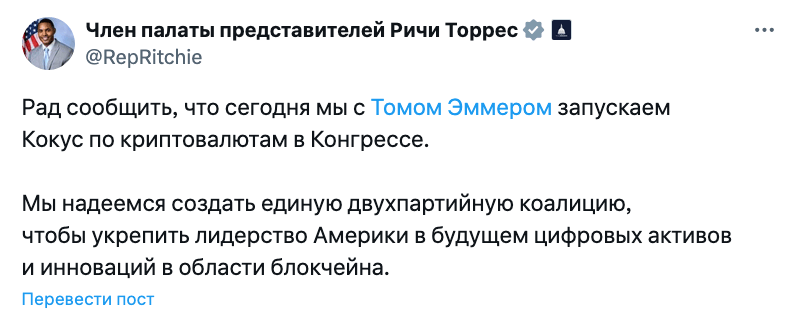Торрес известен тем, что отстаивал цифровые активы, разместив в X пост о FIT21 после того, как проголосовал «за» законопроект: