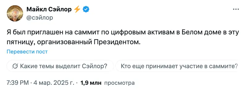 7 марта, по словам Сакса, «известные основатели, генеральные директора и инвесторы из криптоиндустрии» встретятся с членами рабочей группы Трампа по цифровым активам в Белом доме, предположительно, для обсуждения вопросов политики, связанных с криптовалютой и блокчейном, а также потенциальной нормативной базой. Это объявление предшествовало намерению президента США включить Ripple (XRP), Solana (SOL) и Cardano (ADA) в стратегический крипто-резерв, который изучает рабочая группа.