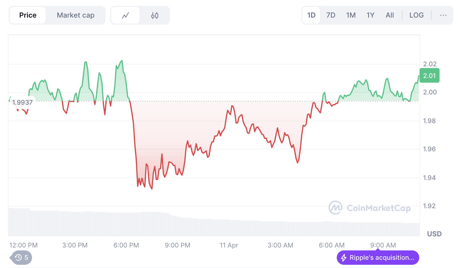 По данным CoinMarketCap, за последние сутки курс криптовалюты Ripple вырос на 1%. На момент написания этого материала XRP торгуется на уровне $2,01, что на 47% меньше исторического максимума (ATH), достигнутого в январе 2018 года на отметке $3,84.