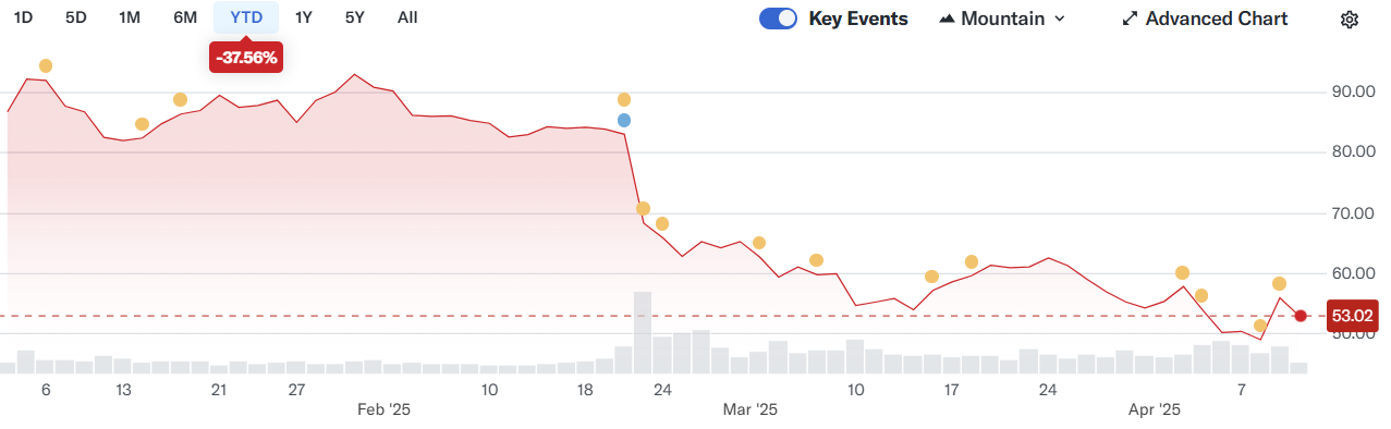 Несмотря на отчеты о сильном росте, цена акций Block Inc. (XYZ) упала более чем на 37% в этом году в рамках распродажи на рынке. Источник: Yahoo Finance.