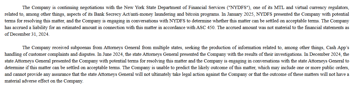 Компания Block подтвердила, что работала с NYDFS, чтобы «разрешить вопрос, в основном связанный с прошлой программой соответствия Cash App». Однако, по данным Bloomberg, компания не признала за собой никаких нарушений.