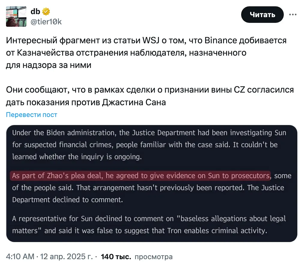 Пост Сана на X появился всего через несколько часов после того, как появились предположения о том, что 11 апреля Wall Street Journal опубликовал отчет, в котором утверждалось, что Чжао согласился предоставить доказательства против Сана в рамках его сделки о признании вины, ссылаясь на источники, знакомые с этим вопросом.