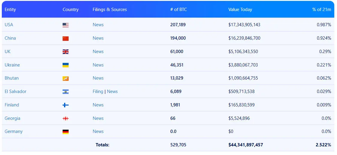 Страны и правительства, владеющие BTC. Источник: Bitbo.
