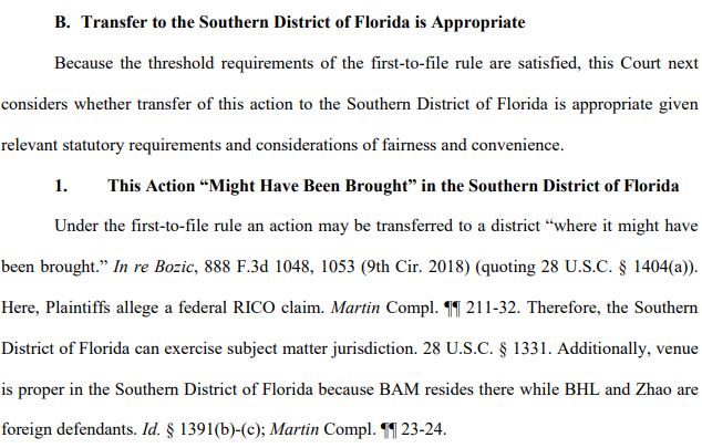 Юристы, представляющие истцов в деле из Вашингтона, утверждают, что оно отличалось от иска из Флориды, поскольку в нем были добавлены другие обвинения, отсутствовавшие в иске из Флориды, и в качестве ответчика был назван бывший генеральный директор Чанпэн «CZ» Чжао.