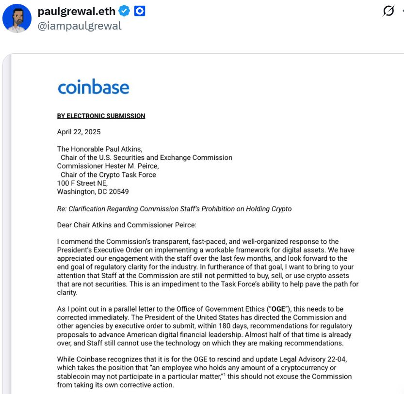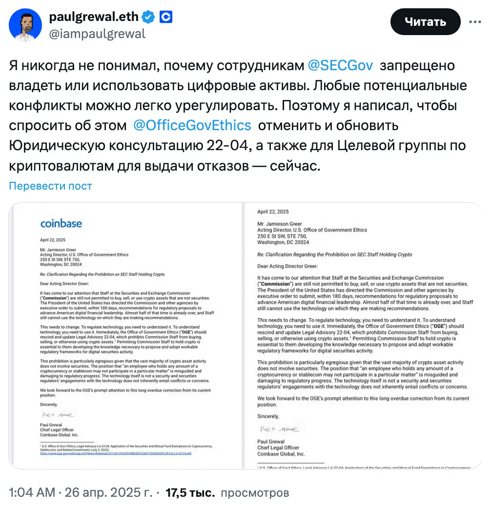 Сотрудникам SEC необходимо использовать криптовалюту, чтобы лучше понимать, как она работает, и как лучше ее регулировать, заявил главный юридический директор Coinbase Пол Гревал в открытых письмах, отправленных исполняющему обязанности директора OGE Джеймисону Гриру и недавно приведенному к присяге председателю SEC Полу Аткинсу, которыми он поделился на X 25 апреля.