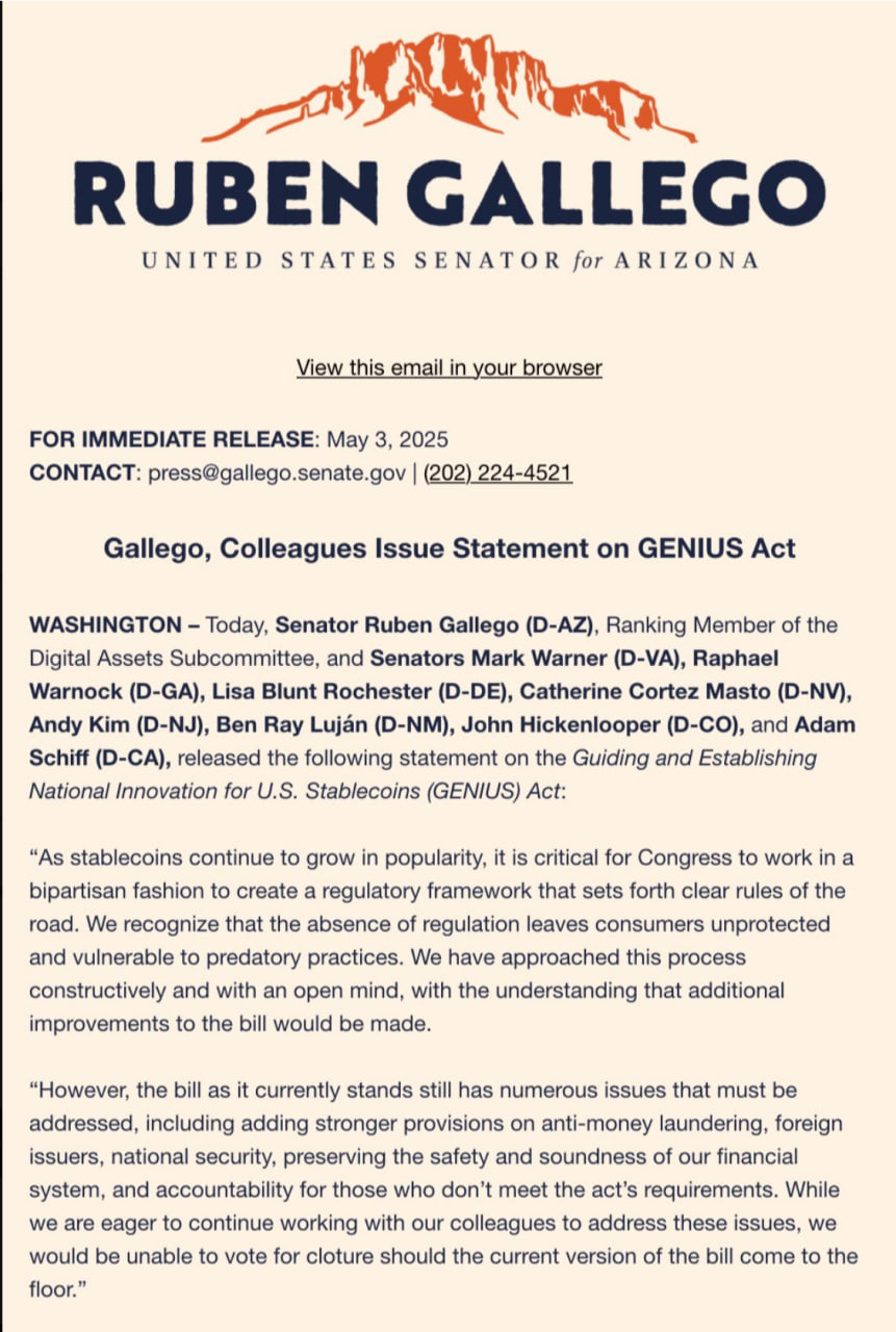 Группа демократов в Сенате США, известная своей поддержкой криптовалютной индустрии, заявила, что выступит против законопроекта о стейблкоинах, предложенного республиканцами, если он будет принят в его нынешнем виде.