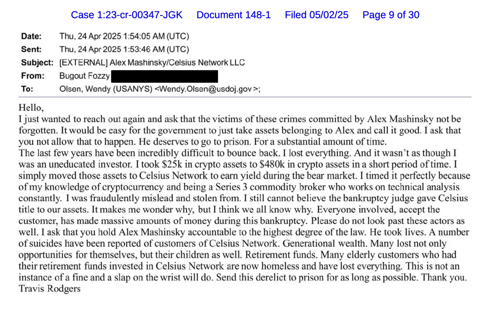 В заявлении от 2 мая в Окружной суд США по Южному округу Нью-Йорка (SDNY) прокуроры опубликовали несколько заявлений о последствиях от лиц, пострадавших от краха Celsius, поданных после первоначального срока. Хотя по крайней мере один из них предложил помиловать бывшего генерального директора, многие рассказали суду о финансовых и личных потерях, вызванных подачей криптофирмой заявления о банкротстве, и намекнули, что Машинский должен быть привлечен к ответственности за искажение информации о компании.