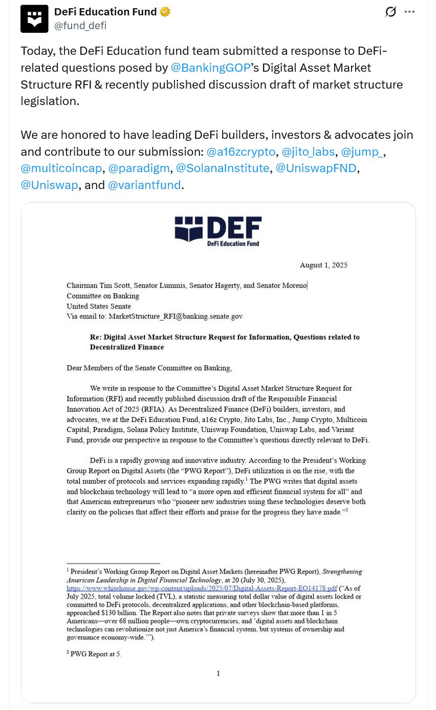 В письме, подписанном представителями Образовательного фонда DeFi (DEF) и таких компаний как a16z Crypto, Uniswap Labs и Paradigm, содержится три ключевых требования. Во-первых, законопроект об ответственных финансовых инновациях 2025 года (RFA) должен быть более технологически нейтральным. Во-вторых, разработчики криптовалют нуждаются в защите от «несоразмерного регулирования, предназначенного для посредников». В-третьих, необходимо гарантировать права на самостоятельное хранение активов для всех американцев.