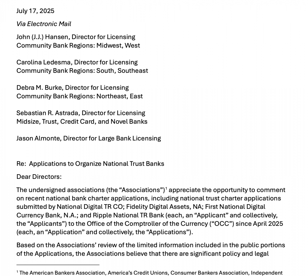 Согласно письму в Управление контролера денежного обращения (OCC) от 17 июля, Американская банковская ассоциация, Ассоциация банков-потребителей, Национальная банковская ассоциация, Американские кредитные союзы и Независимые общественные банкиры Америки стремятся заблокировать банковские приложения от четырех поставщиков цифровых активов, включая Ripple и Fidelity.