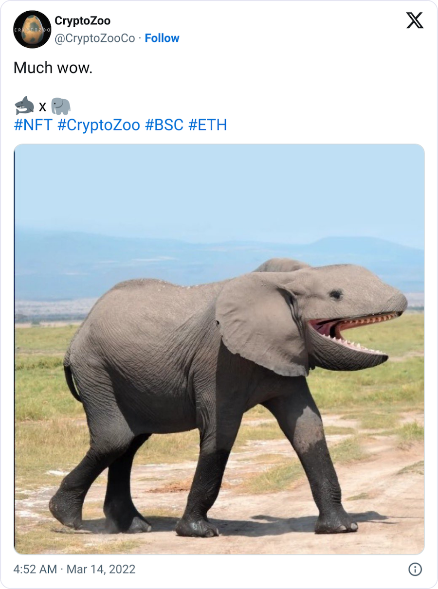 Пример гибридного животного CryptoZoo NFT, представляющего собой нечто среднее между слоном и акулой. Источник: CryptoZoo