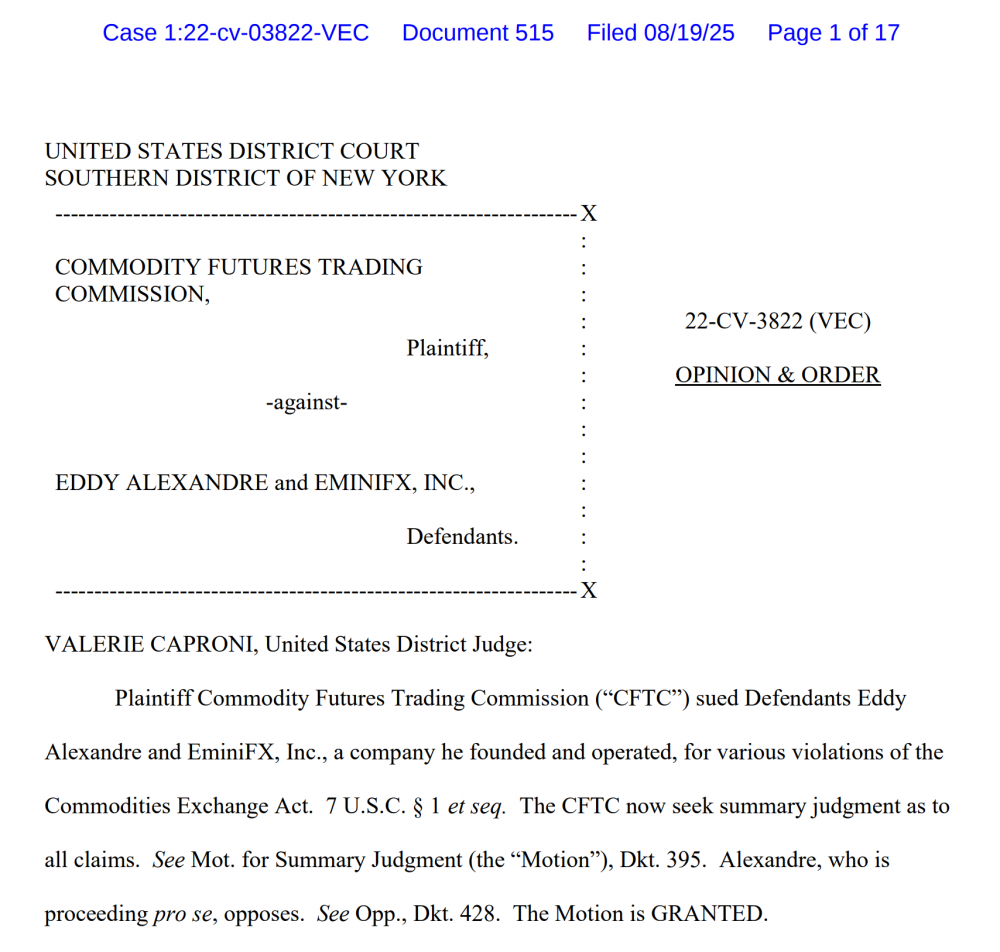 Комиссия по торговле товарными фьючерсами США (CFTC) добилась вынесения решения в порядке упрощенного судопроизводства против Александра и EminiFX, а окружной судья США Валери Капрони признала их солидарно ответственными за возмещение ущерба в размере более 228 миллионов долларов США. Еще 15 миллионов долларов США ответчики должны выплатить в качестве возврата незаконно полученной прибыли.