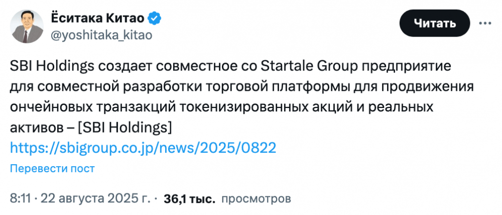 В рамках сотрудничества SBI совместно со Startale работает над созданием платформы для токенизированных акций и других реальных активов.