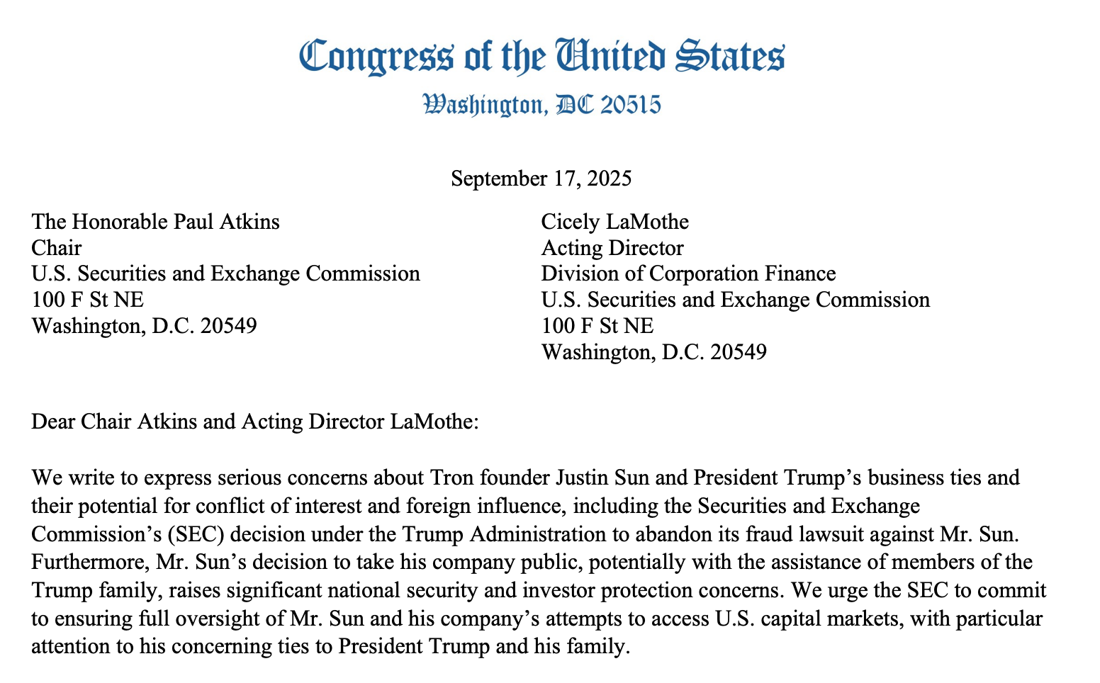 В письме, направленном в среду председателю SEC Полу Аткинсу и исполняющей обязанности директора отдела корпоративных финансов комиссии Сисели Ламот, сенатор Джефф Меркли и конгрессмен Шон Кастен подвергли сомнению своевременность прекращения агентством дела о принудительном исполнении против основателя и генерального директора Tron Джастина Сана.