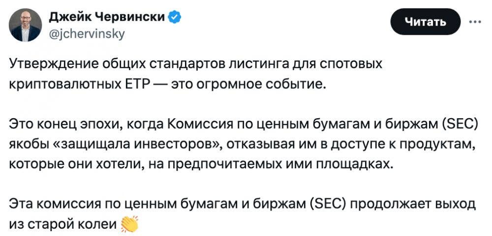 Аналитик Bloomberg по ETF Джеймс Сейфарт заявил, что изменение политики, объявленное SEC 17 сентября, станет позитивным шагом на пути к «волне запусков спотовых криптовалютных ETP».