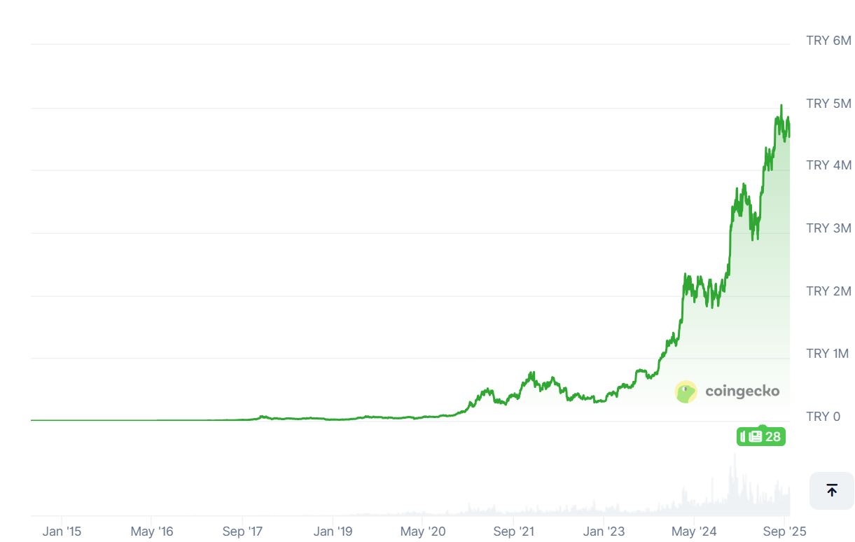 Чтобы проиллюстрировать масштаб падения лиры: в 2020 году один биткоин стоил около 100 000 турецких лир. Сегодня эта цифра превышает 4,6 млн лир, что отражает как рост цены биткоина, так и резкое обесценивание лиры.