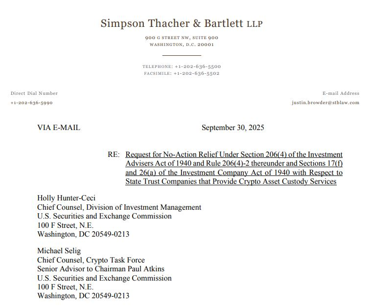 Юридическая фирма Simpson Thacher & Bartlett запросила у Комиссии по ценным бумагам и биржам США (SEC) гарантии того, что государственные трастовые компании могут хранить криптовалютные активы. Источник: SEC.