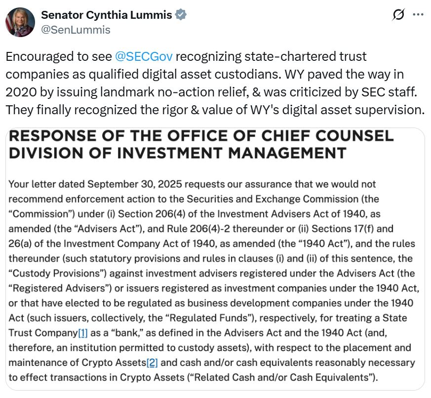 Тем временем сенатор от Вайоминга Синтия Ламмис «воодушевилась тем, что Комиссия по ценным бумагам и биржам (SEC) признала трастовые компании, зарегистрированные в штате, в качестве квалифицированных хранителей цифровых активов», а также отметила, что ее штат еще в 2020 году предпринял аналогичный шаг, который Комиссия по ценным бумагам и биржам (SEC) при Байдене в то время осудила.