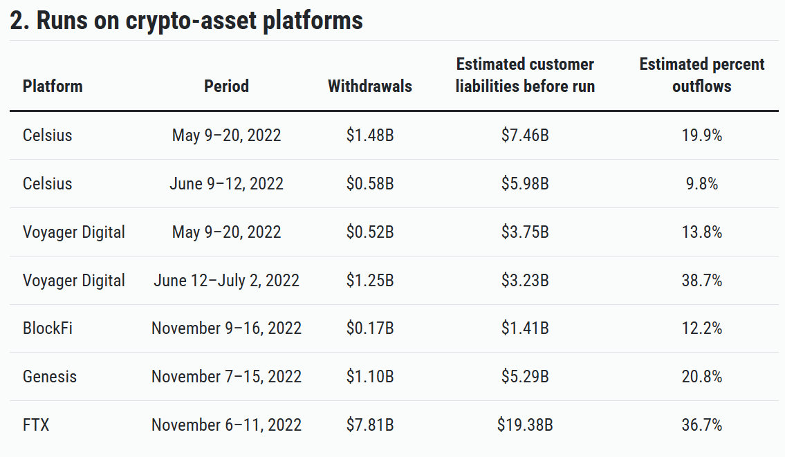 Согласно анализу Федерального резервного банка Чикаго, в период с мая по ноябрь 2022 года клиенты вывели почти 13 000 000 000 долларов с платформ криптовалютных активов, поскольку доверие к сектору резко упало.