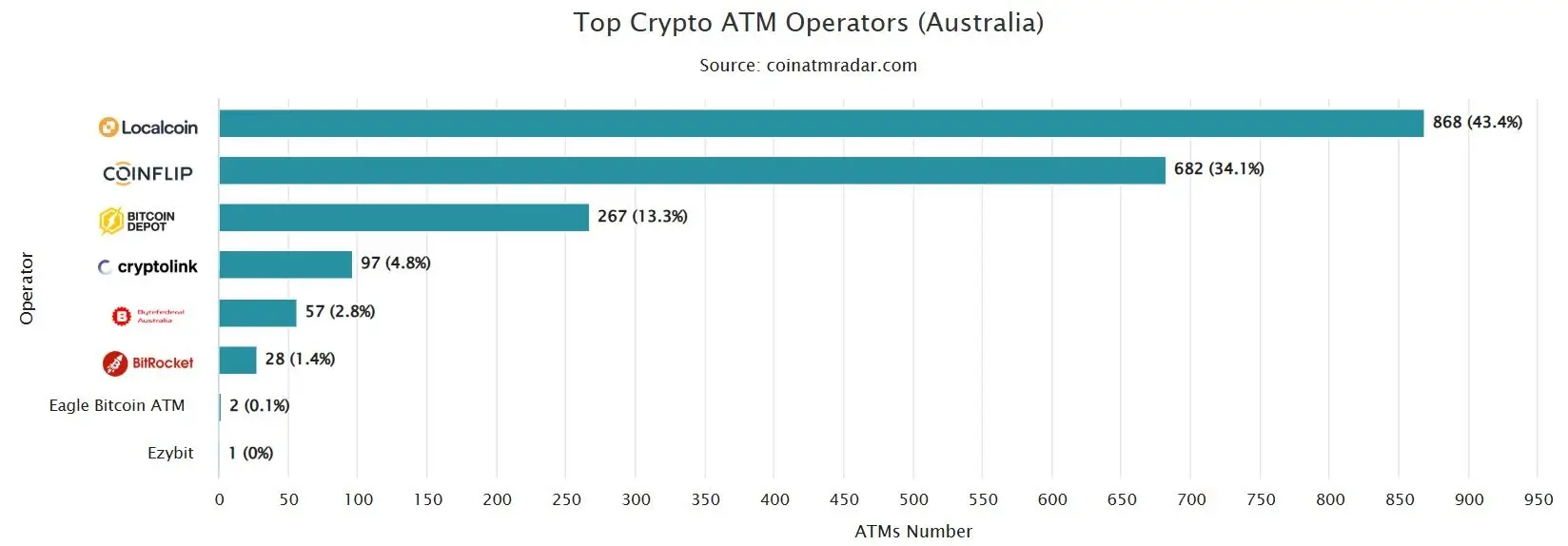 Более половины криптобанкоматов в Австралии обслуживаются тремя провайдерами: Localcoin (868 устройств), Coinflip (682 банкомата) и Bitcoin Depot с 267 устройствами.