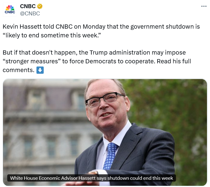 «Я думаю, что приостановка работы правительства по инициативе Шумера, скорее всего, закончится на этой неделе», — заявил Хассетт в понедельник в программе Squawk Box на CNBC, имея в виду лидера меньшинства в Сенате Чака Шумера, которого республиканцы обвиняют в том, что он спровоцировал приостановку работы правительства.