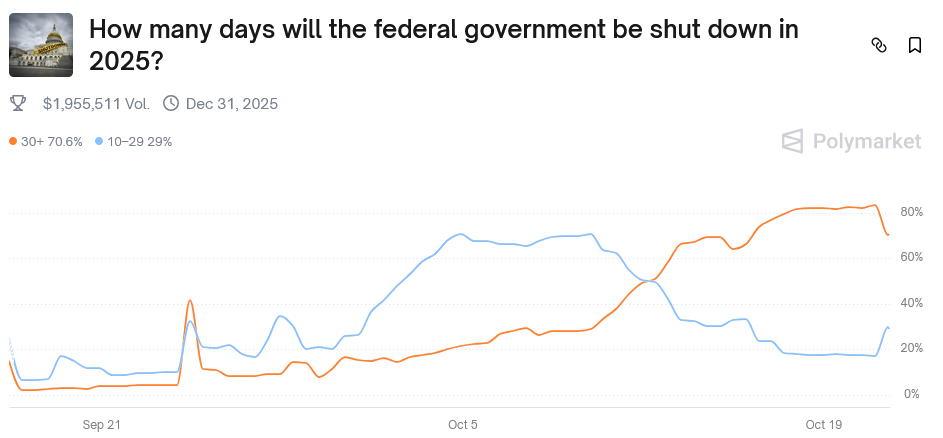 Несмотря на оптимизм Хассетта, по оценкам Polymarket, вероятность того, что отключение продлится более 30 дней, составляет 71 %, то есть как минимум до 31 октября.